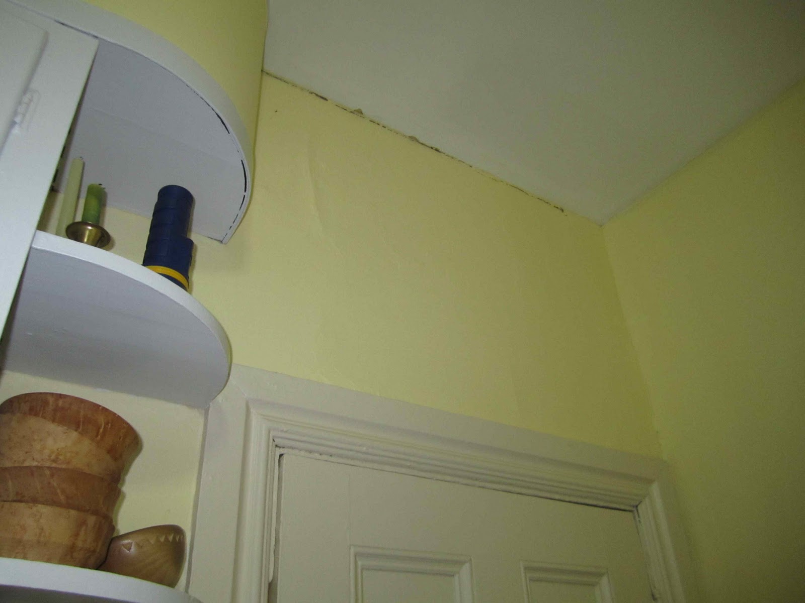 If you can see, you'll notice the strange brown spot above the door. When I was peeling the wallpaper, parts of the wall, or what I thought was the wall, was actually coming off with the paper! It turns out that years and years ago there was linoleum flooring (or something that looked like linoleum flooring) on the wall and then covered up with a few layers of paint once someone realized that was a horrible idea. So this lovely site emerged and after my panic subsided I realized that it wasn't a big deal and I could 'fix it' with some wall putty - phew: